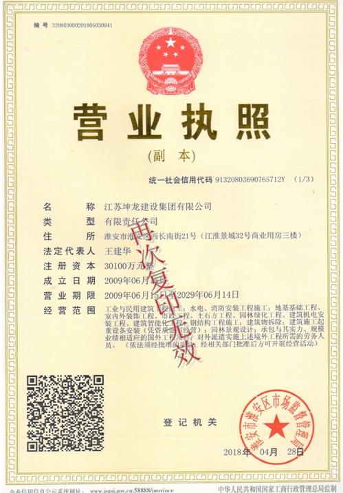 近年来,我公司业务范围不断拓展,由我公司控股成立的子公司日益增多,公司实现了跨越式发展,具备了组建集团公司的条件。近期公司向市场监督管理部门提交了注册登记为集团公司的申请,并于4月28日领回了变更后的营业执照,这标志着我公司已正式注册登记为集团公司,集团公司的名称为“江苏坤龙建设集团有限公司”。